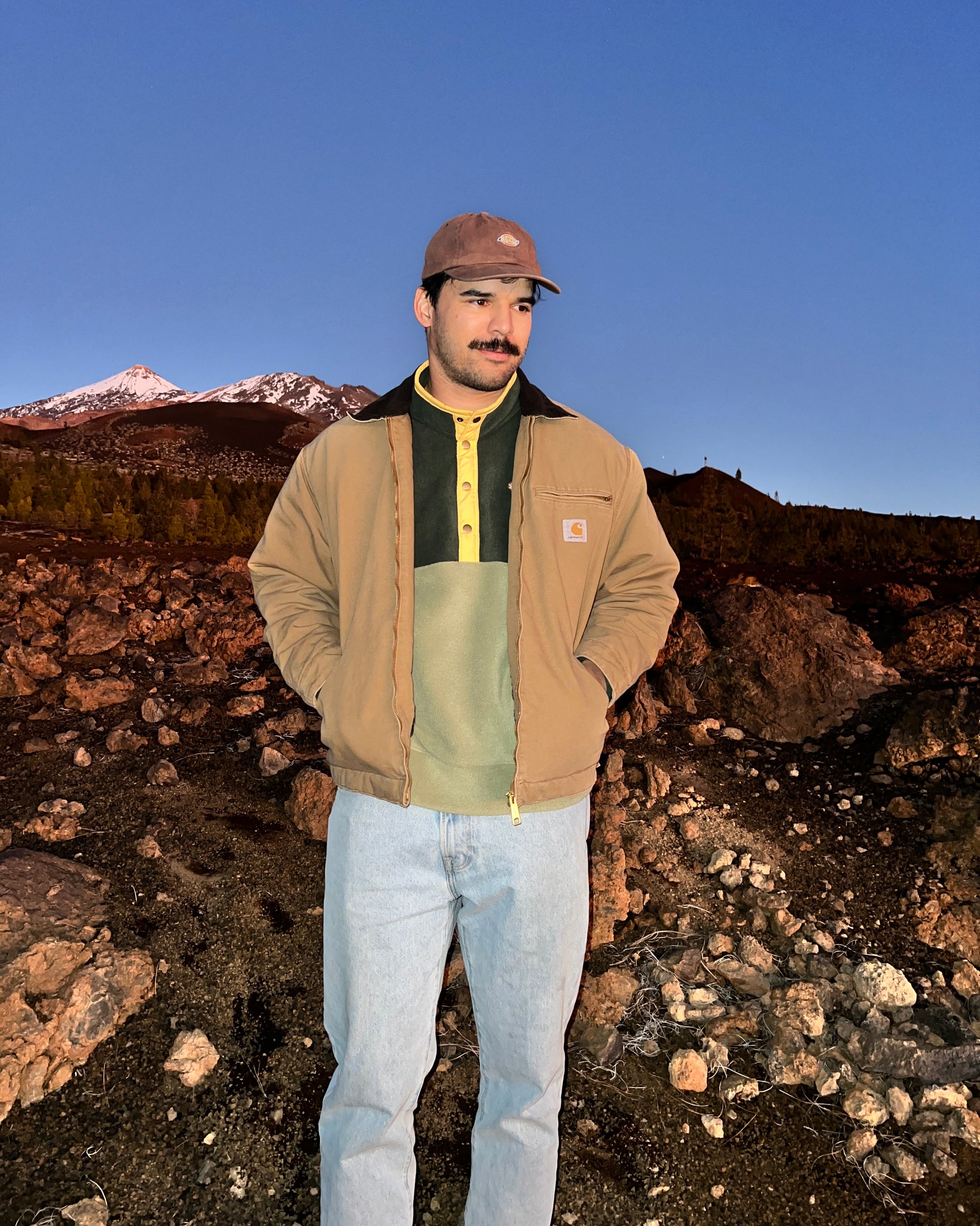Popper fleece with a dark green upper body, green lower body and a yellow popper opening. Upper half is lined. Features an embroidered Surf Coo patch. In the photos I'm wearing women's M and Luis is wearing men's L.