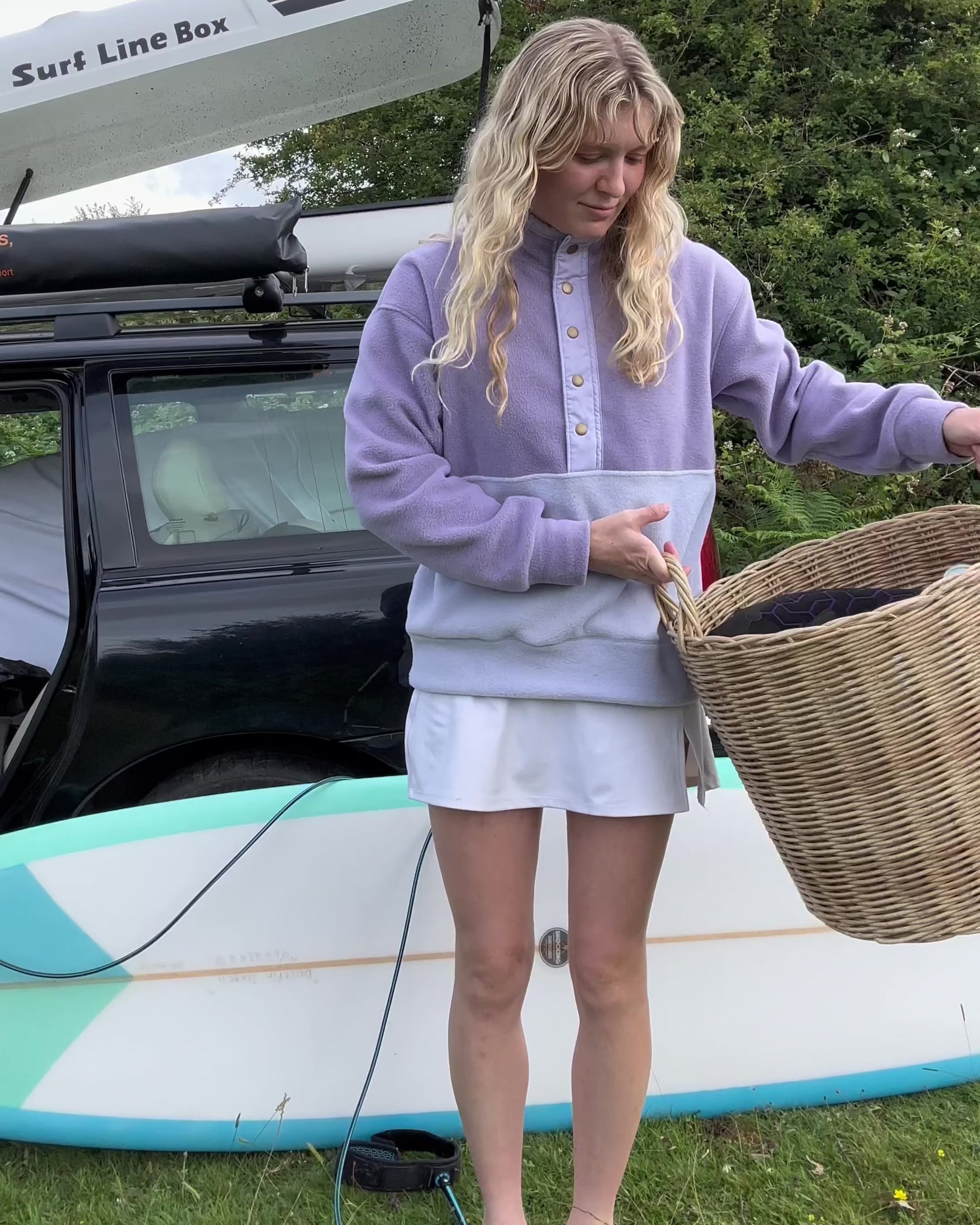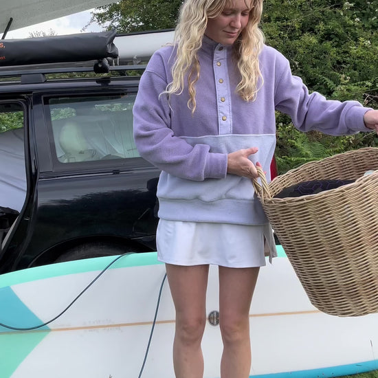Popper fleece with a lilac upper and light lilac lower body and placket opening. Upper half is lined. Features an embroidered Surf Coo patch.